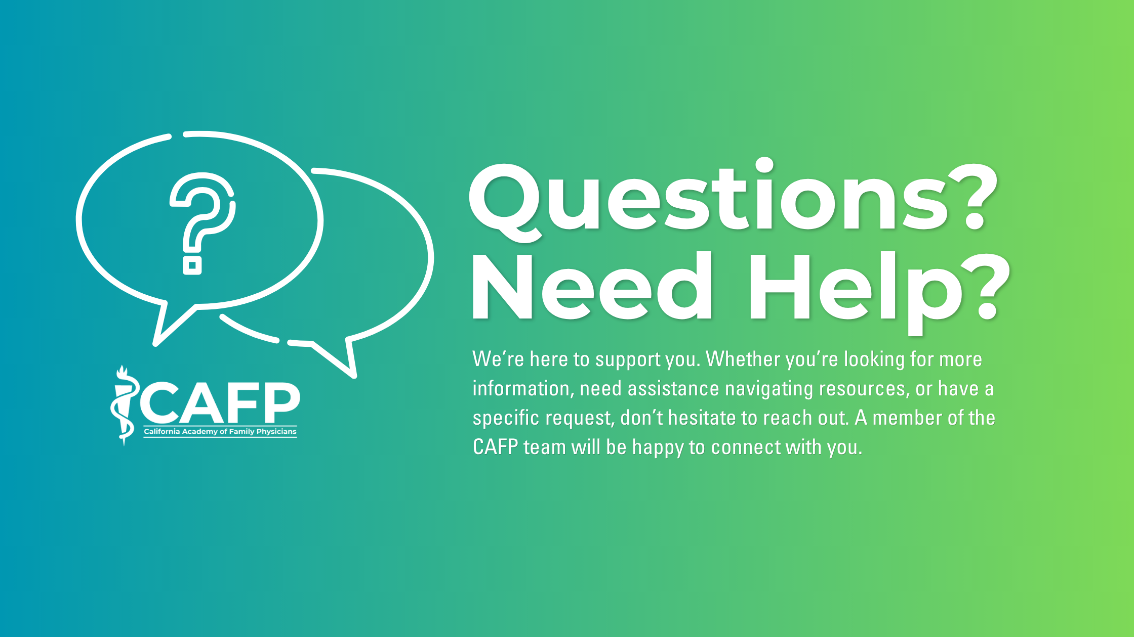 Need help? We’re here to support you. Whether you’re looking for more information, need assistance navigating resources, or have a specific request, don’t hesitate to reach out. A member of the CAFP team will be happy to connect with you. You can email us anytime at cafp@familydocs.org or call, (415) 345-8667.