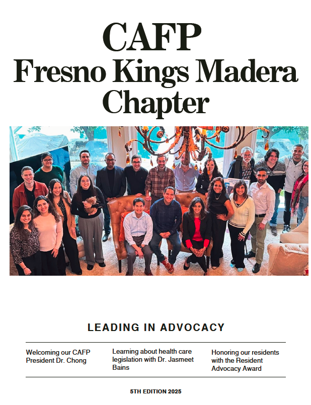CAFP Fresno Kings Madera Chapter has been active since 2014. The chapter has grown to include more than 300 members and currently includes active physicians, residents, and medical students in the executive committee. The executive committee meets quarterly, has organized CME, publishes bi-annual newsletters, and participates in advocacy events sponsored by CAFP. We strive to support physicians in our chapter in advocating for their patients, community, and peers.