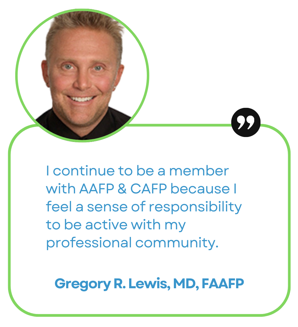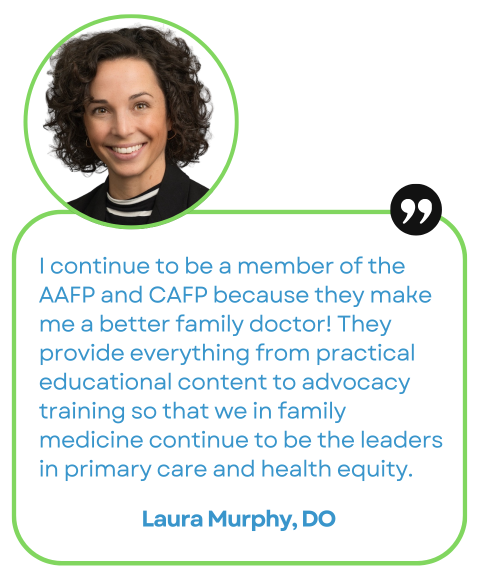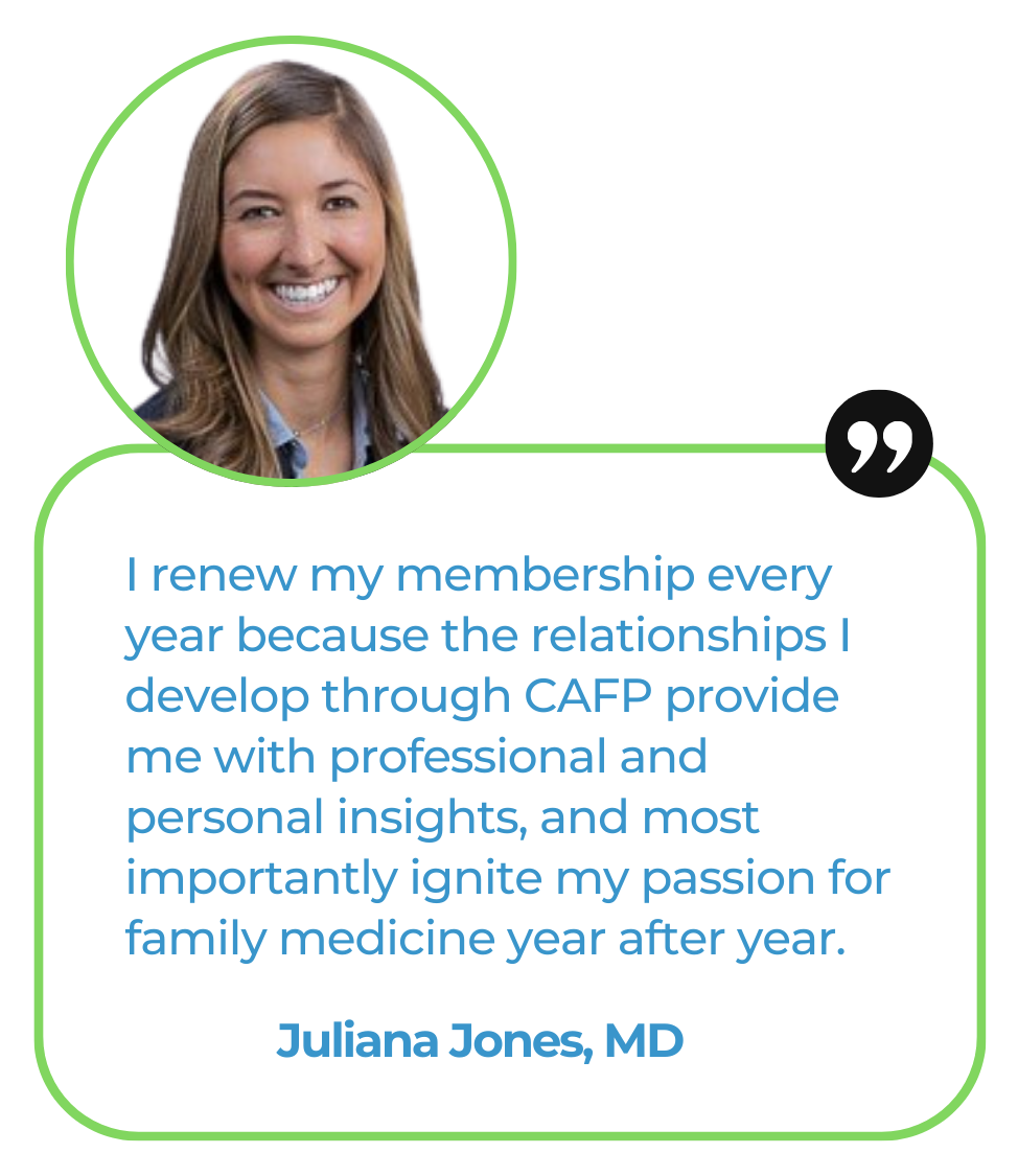 A membership with AAFP and CAFP offers tools, connections, and support to thrive at every stage of your career in family medicine. Connect with peers across the state through in-person and virtual events, national and local chapter meetings, and stay engaged year-round with our 365 App. You’ll build leadership skills, share real-world experiences, and become part of a community that understands the challenges and rewards of family medicine.