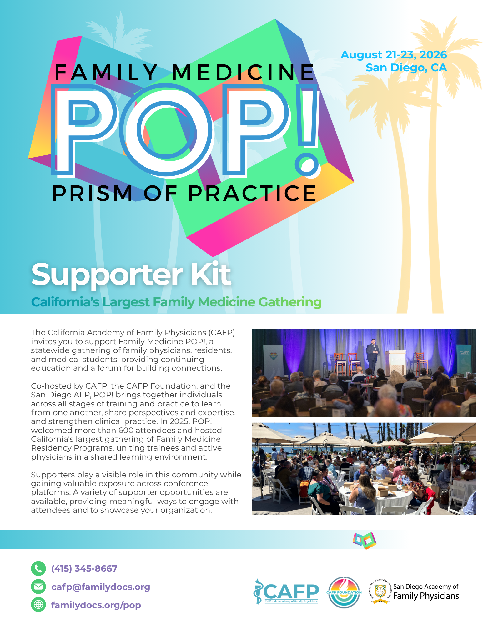 At POP! you’ll find great medical education, networking, energetic workshops, career guidance, keynotes, and the Residency Recruitment Fair, to make it one conference you won't want to miss! The 2026 & 2027 POP events will be held in coordination with CAFP, the CAFP Foundation and the San Diego AFP at Paradise Point Resort & Hotel in San Diego, CA.